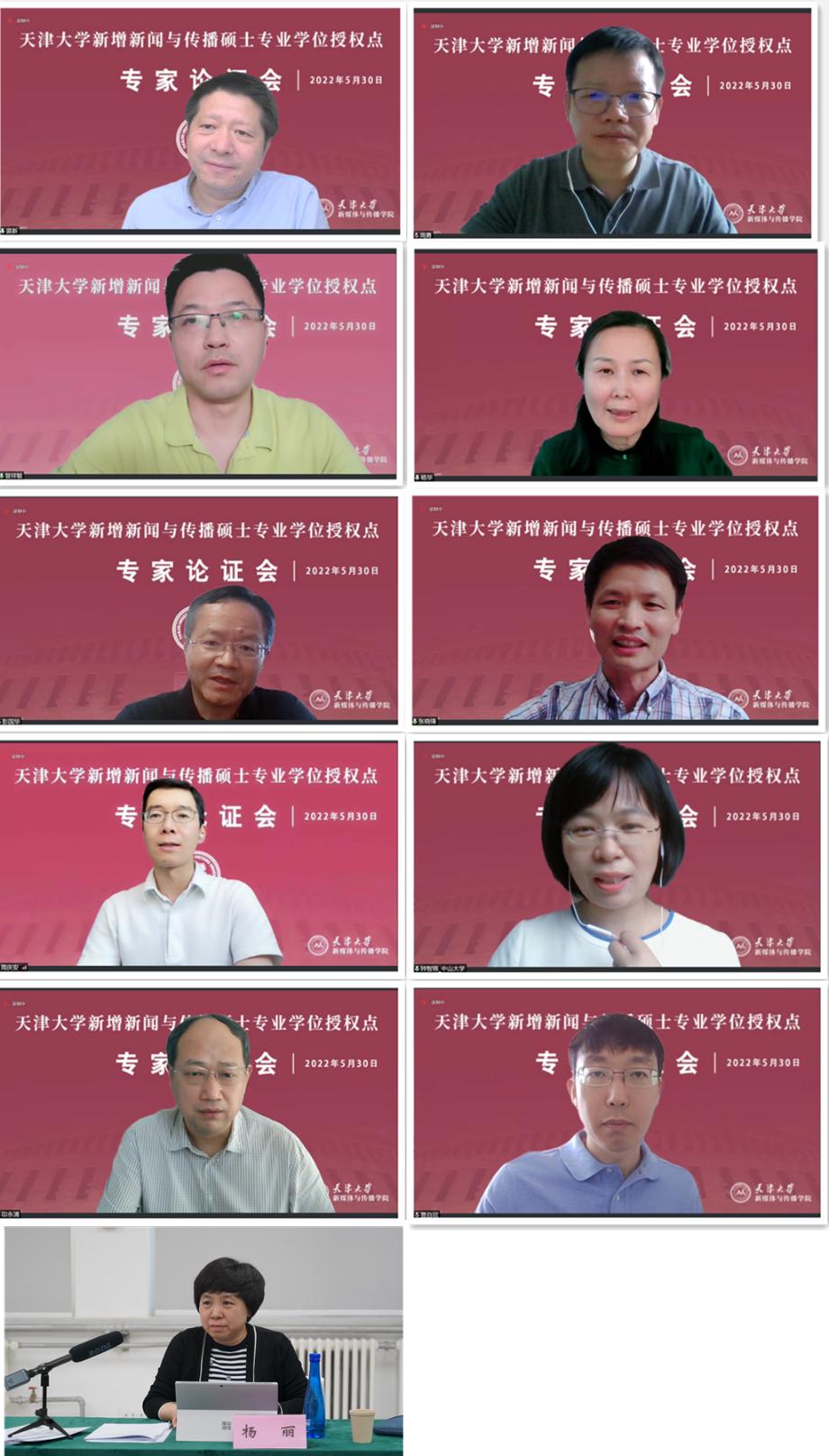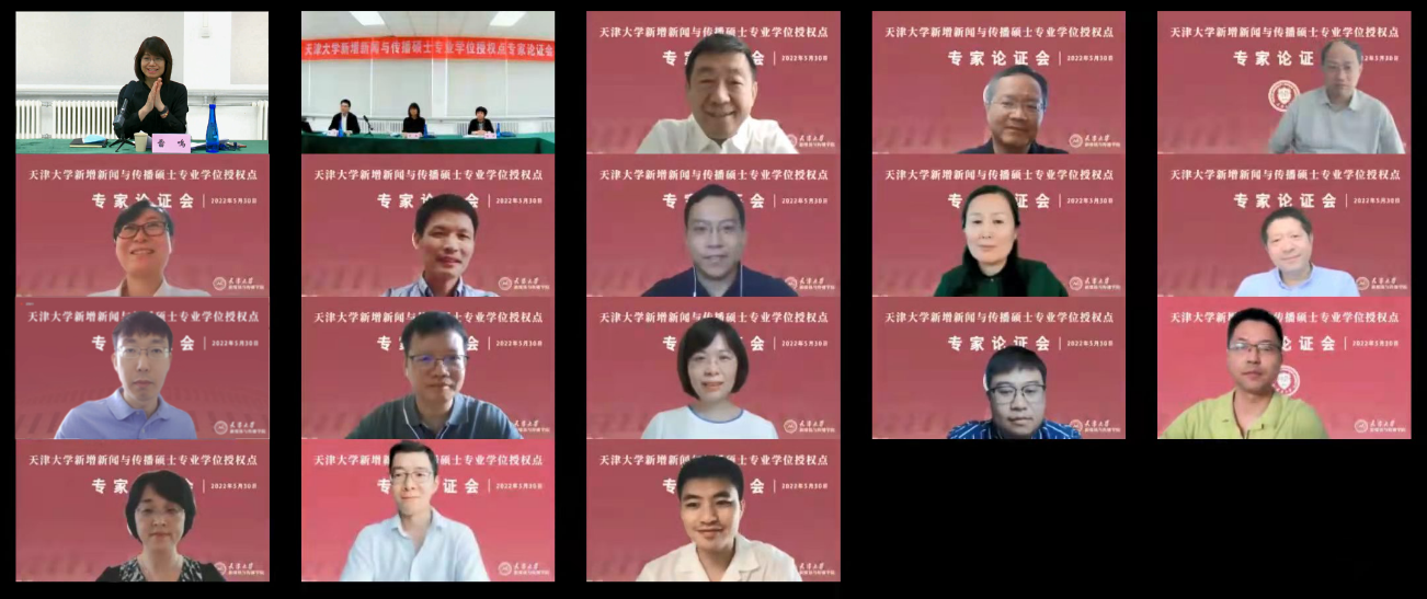 论证会专家组由复旦大学党委常务副书记、全国新闻与传播专业学位研究生教育指导委员会副主任委员裘新教授担任组长。成员包括中国人民大学新闻学院院长、全国新闻与传播专业学位研究生教育指导委员会副主任委员周勇教授;中国传媒大学电视学院党委书记、全国新闻与传播专业学位研究生教育指导委员会副主任委员曾祥敏教授;中央广播电视总台创新发展研究中心召集人、全国新闻与传播专业学位研究生教育指导委员会委员杨华主任;人民日报理论部副主任、全国新闻与传播专业学位研究生教育指导委员会委员彭国华主任;南京师范大学新闻与传播学院院长、全国新闻与传播专业学位研究生教育指导委员会委员张晓锋教授;清华大学新闻与传播学院副院长、全国新闻与传播专业学位研究生教育指导委员会委员周庆安教授;中山大学传播与设计学院教授、全国新闻与传播专业学位研究生教育指导委员会委员钟智锦教授;天津海河传媒中心副总裁,天津广播电视事业部总编辑印永清总;天津市委宣传部新闻处贾自欣处长;日本成人电影 应用心理研究所所长、心理健康教育中心主任杨丽教授。疫情防控常态化背景下,专家论证会采用线上线下相结合的形式开展。在会议开始前,与会嘉宾共同在线完成合影。
