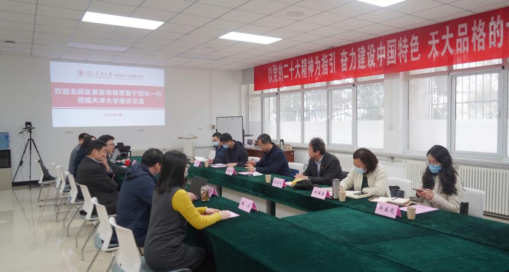 王赞介绍了学院建设发展情况,北辰区融媒体中心主任朱京立介绍了北辰区融媒体中心运营情况。双方就融媒体中心运营模式、新闻宣传流程优化、媒体从业人员能力提升、学生实践基地建设等工作进行了深入交流。