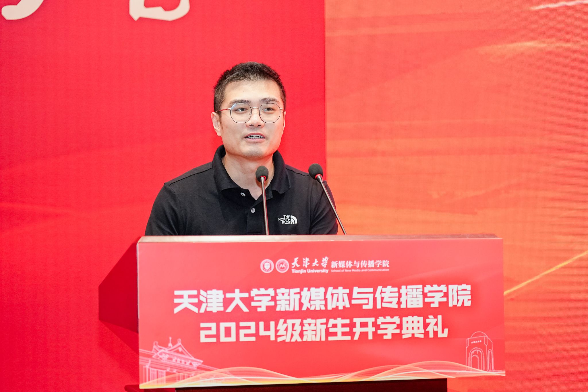 2023级新闻传播学硕士研究生张凯歌同学作为在校生代表发言,他从自身经历出发,围绕“以何种姿态开启研究生生涯”这一主题,分享了在新媒体学院的成长感悟。张凯歌同学鼓励新生积极面对挑战,勇敢追求梦想,充分利用学院提供的资源和机会,不断提升自己的能力和素质。2024级新生代表张旻尧、谢艺观和张芊同学也分别发言,他们从不同的角度表达了对未来学习生活的期待和对新媒体领域的热忱。张旻尧同学分享了他对新闻传播学学习的思考和期待,强调了互联网力量对社会的积极影响。谢艺观同学作为非全日制硕士研究生代表,分享了重返校园的激动心情和对专业成长的期待。张芊同学则从跨学科的角度,讨论了个人发展中的选择和挑战,鼓励同学们大胆探索,勇敢尝试。“让我们携手并进,在各自的岗位上发光发热,共同见证并参与这个时代的伟大变革,以实际行动践行社会责任,共同书写属于我们的、更加精彩绝伦的历史篇章!”