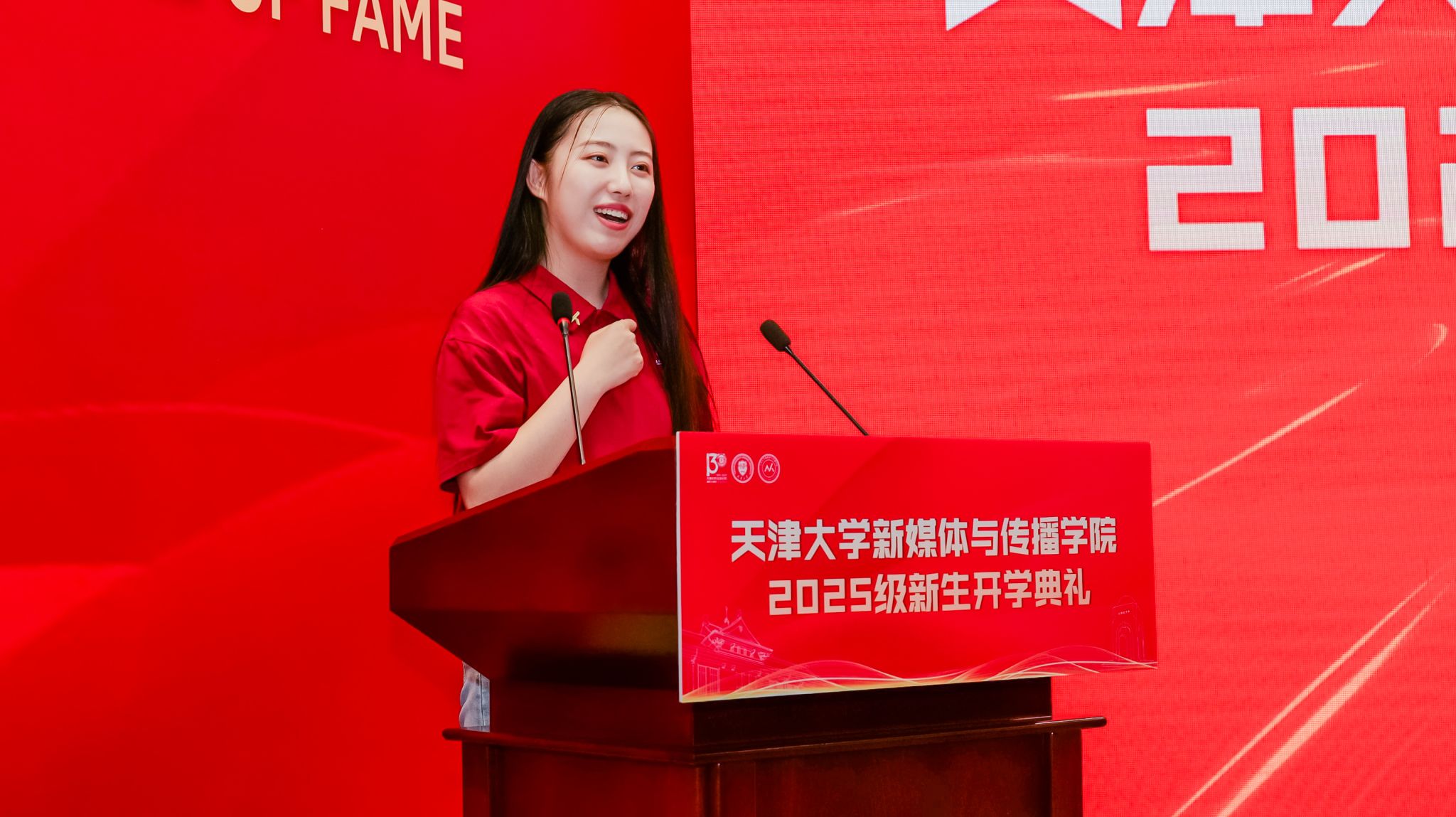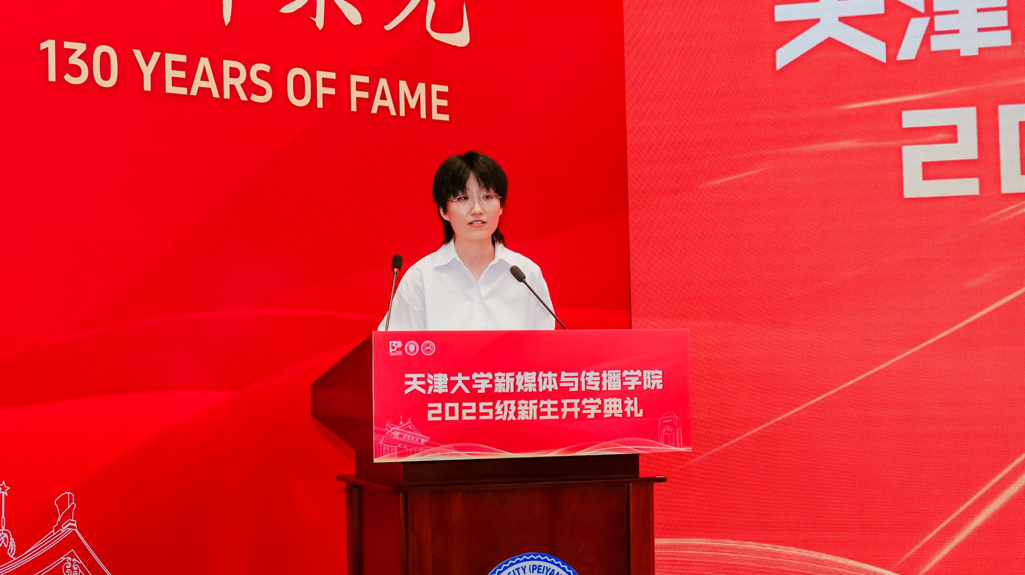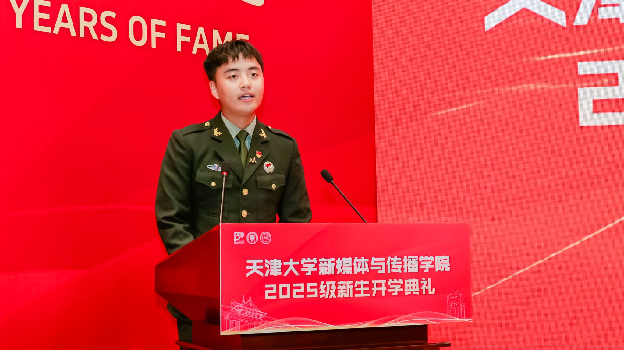 新生代表2025级硕士研究生贾珮瑶和王家培分享了他们的故事与展望。贾珮瑶讲述了自己为“向世界讲述一个生动精彩的中国故事”而来到天大的初心,表达了将个人奋斗融入时代征程的决心。王家培作为一名退役大学生士兵和新生军训教官,分享了自己从新闻记录者到成长见证者的身份转变,立志以笔为剑、以镜头为盾,践行新传人的责任与担当。
