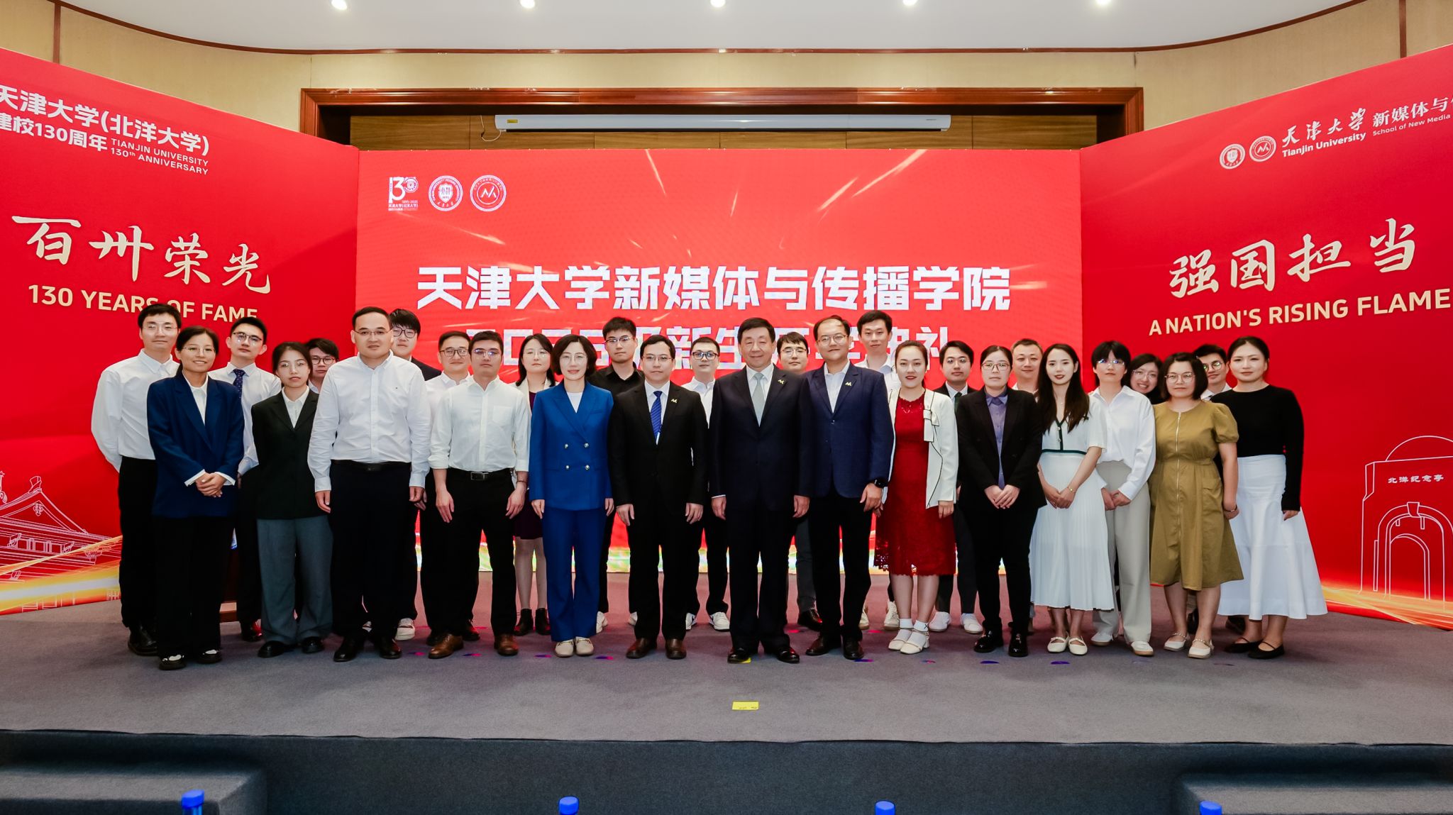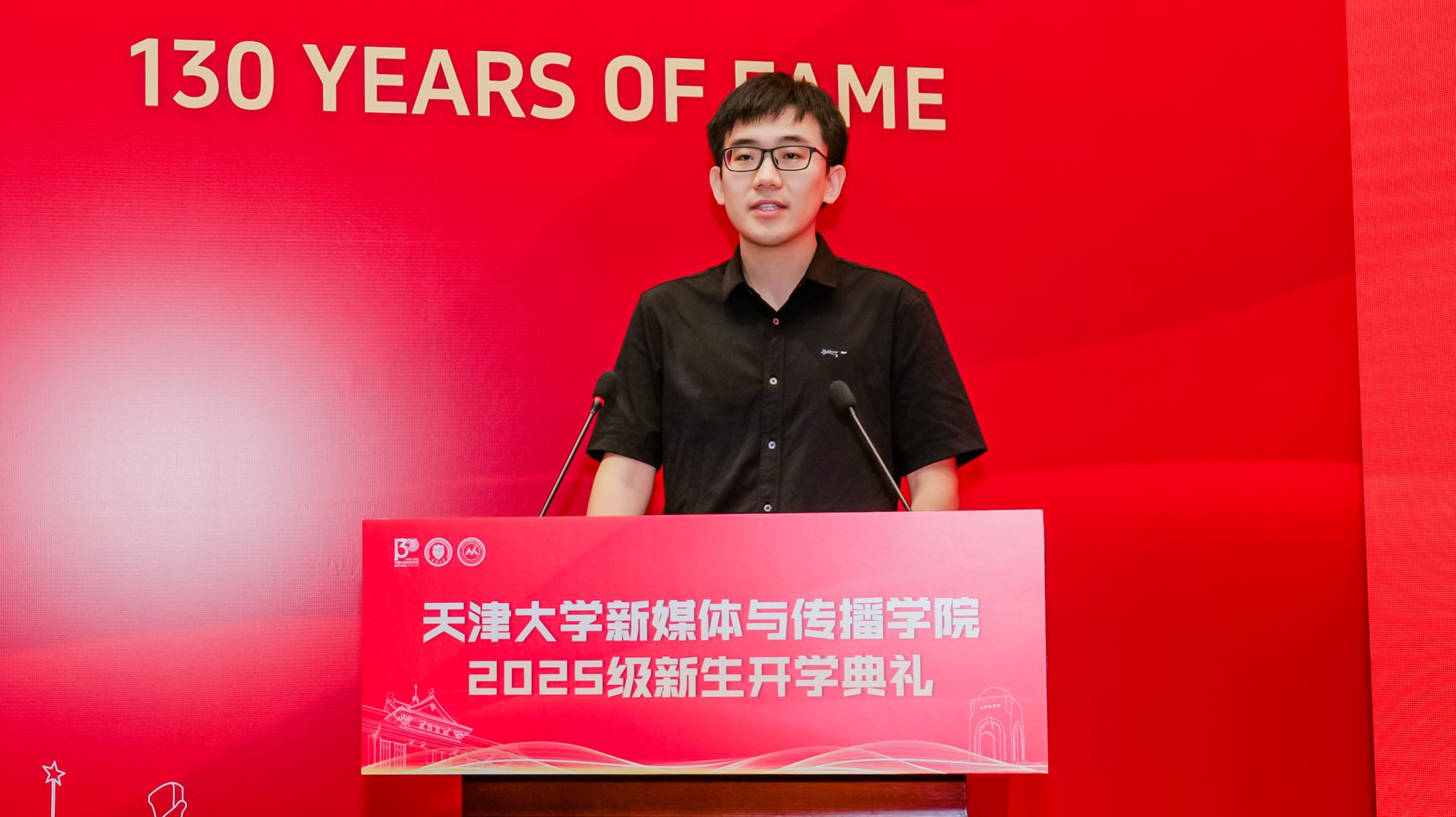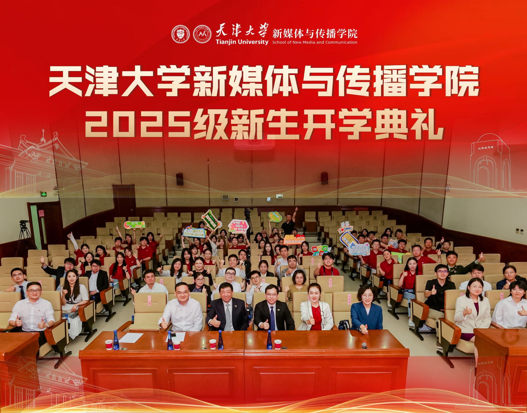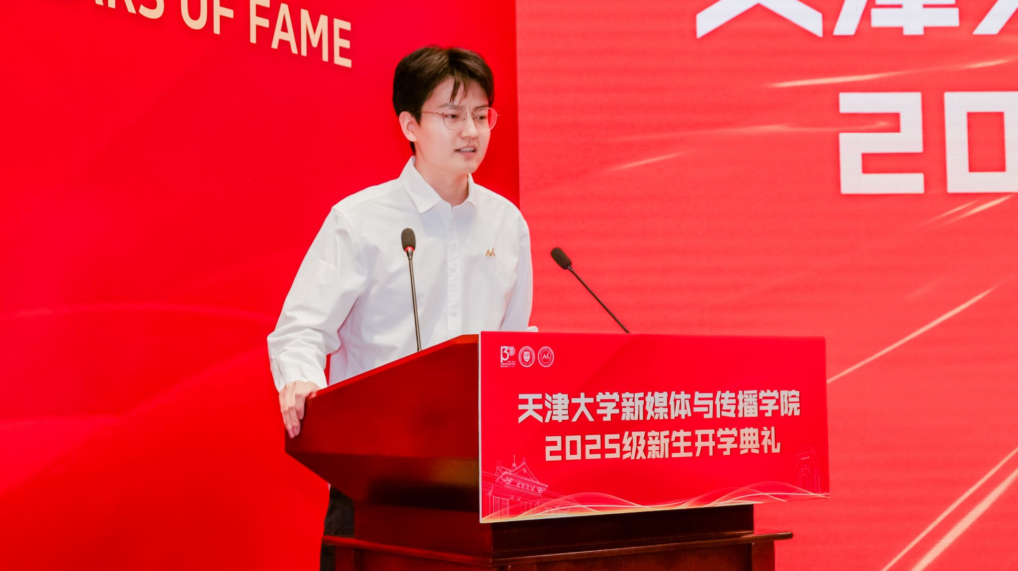 新生代表2025级硕士研究生贾珮瑶和王家培分享了他们的故事与展望。贾珮瑶讲述了自己为“向世界讲述一个生动精彩的中国故事”而来到天大的初心,表达了将个人奋斗融入时代征程的决心。王家培作为一名退役大学生士兵和新生军训教官,分享了自己从新闻记录者到成长见证者的身份转变,立志以笔为剑、以镜头为盾,践行新传人的责任与担当。