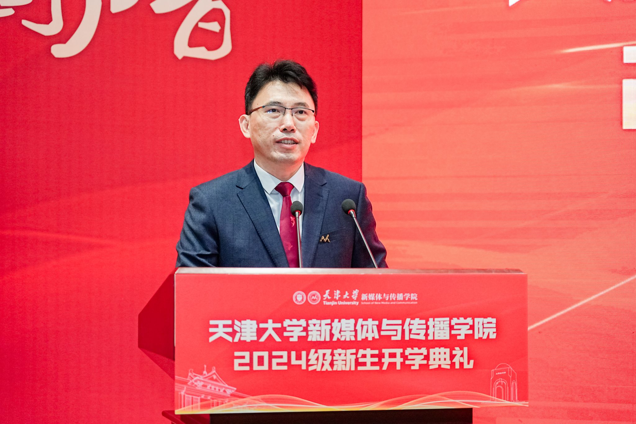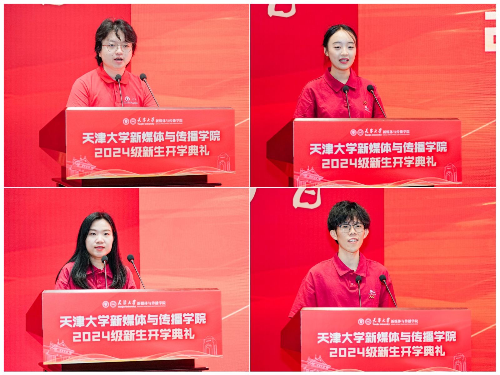 2023级新闻传播学硕士研究生张凯歌同学作为在校生代表发言,他从自身经历出发,围绕“以何种姿态开启研究生生涯”这一主题,分享了在新媒体学院的成长感悟。张凯歌同学鼓励新生积极面对挑战,勇敢追求梦想,充分利用学院提供的资源和机会,不断提升自己的能力和素质。2024级新生代表张旻尧、谢艺观和张芊同学也分别发言,他们从不同的角度表达了对未来学习生活的期待和对新媒体领域的热忱。张旻尧同学分享了他对新闻传播学学习的思考和期待,强调了互联网力量对社会的积极影响。谢艺观同学作为非全日制硕士研究生代表,分享了重返校园的激动心情和对专业成长的期待。张芊同学则从跨学科的角度,讨论了个人发展中的选择和挑战,鼓励同学们大胆探索,勇敢尝试。“让我们携手并进,在各自的岗位上发光发热,共同见证并参与这个时代的伟大变革,以实际行动践行社会责任,共同书写属于我们的、更加精彩绝伦的历史篇章!”